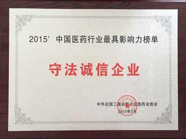我公司榮膺2015“中國醫藥制造業百強企業”、“中國醫藥制造業十佳集團金牌采購商”、“守法誠信企業”榮譽稱號(2016/5/17)