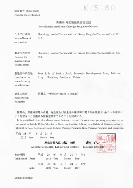 近日,恒欣藥業獲得了日本厚生勞動省頒發的《醫藥品外國制造業者認定證書》,這標志著山東羅欣藥業集團恒欣藥業有限公司的非無菌系列原料藥通過了日本AFM場地認證。接下來,我們會陸續進行產品認證MF注冊和接受日本GMP符合性檢查,將產品出口日本。