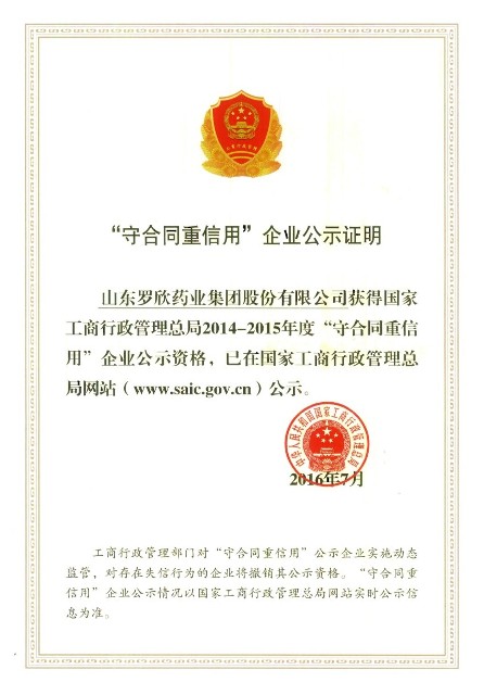 日前,國家工商行政管理總局下發2014-2015年度國家級“守合同重信用”企業名單,山東羅欣藥業集團股份有限公司成功入選。國家級“守合同重信用”企業評選是國家工商行政管理總局依據企業合同信息的客觀記錄,經過嚴格評估,并對合同履約信用程度達到規定標準的企業,面向社會公示、進行認定的一項合同信用等級評選活動。旨在推進社會誠信體系建設,規范企業合同行為、引導企業誠信履約、守法經營。國家“守合同重信用”是政府權威認定的“信用最高褒獎”,是企業不可或缺的重要品質之一,是企業的核心競爭力。