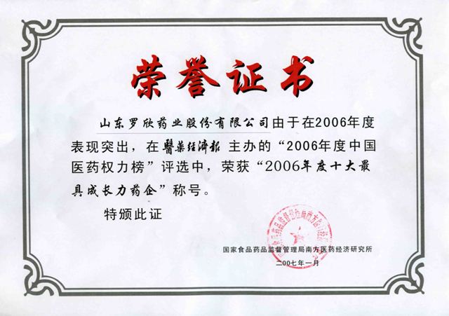 由于2006年年度表現突出,在國家食品藥品監督管理局南方醫藥經濟研究所“2006年中國醫藥權力榜”評選中,榮獲“2006年最具成長力藥企”稱號。