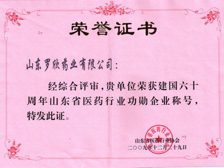 2009年12月,山東羅欣藥業股份有限公司被山東省醫藥行業協會評為建國六十周年山東省醫藥行業“功勛企業”。