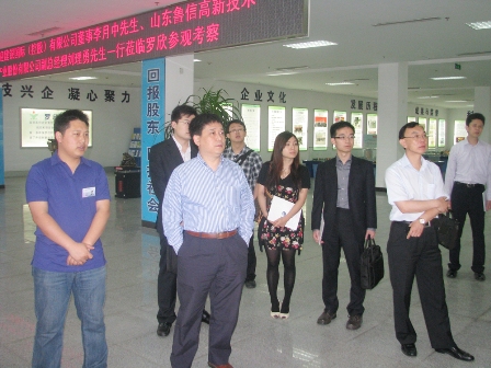 上圖為建銀國際(控股)有限公司董事李月中先生(前排左二)、山東魯信高新技術產業股份有限公司副總經理劉理勇(前排右一)先生一行參觀公司展廳時的情景