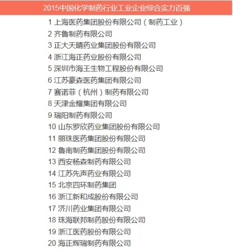 上圖為2015中國化學制藥行業工業企業綜合實力百強前20強榜單